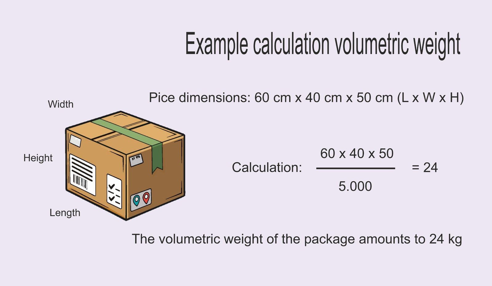 Volumetric Weight = (50 cm × 40 cm × 30 cm) / 5000 = 12 kg